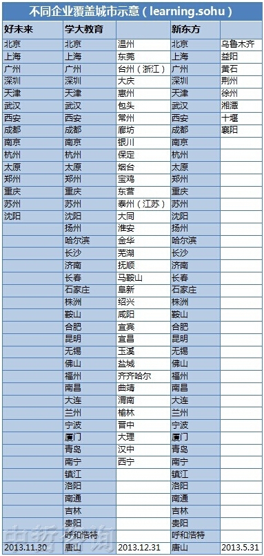 主要课外辅导品牌的城市布局情况(数据来源:搜狐教育)