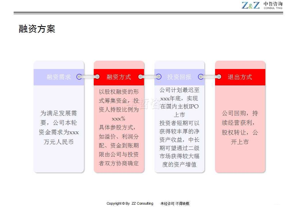 •完善融资策略与财务分析:根据战略规划进行切实的财务分析,并对融资资金使用计划、退出方式等提出适当建议。