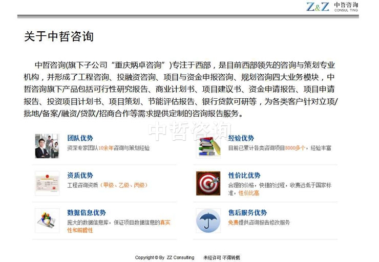 【售后服务优势】:中哲咨询始终把客户的价值诉求放在第一位,对于交付的咨询报告业务,针对各类咨询项目,中哲咨询提供终身免费的咨询报告服务修改期。