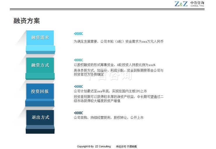 •完善融资策略与财务分析:根据战略规划进行切实的财务分析,并对融资资金使用计划、退出方式等提出适当建议。