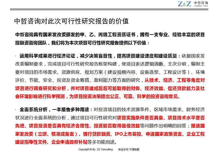 •全面系统分析,一本报告多种用途:对投资项目的技术资源条件、区域市场需求、财务经济状况进行全面系统的分析,通过项目可行性研究对项目实施条件是否具备、项目技术水平是否先进、项目投资是否具有经济合理性、投资能否取得最佳效益等问题作出明确的回答;报送国家发改委(立项、核准或备案)、银行贷款融资、IPO上市募投、申请国家政策资金、企业工程建设指导性文件、企业申请政府补贴等多功能用途。