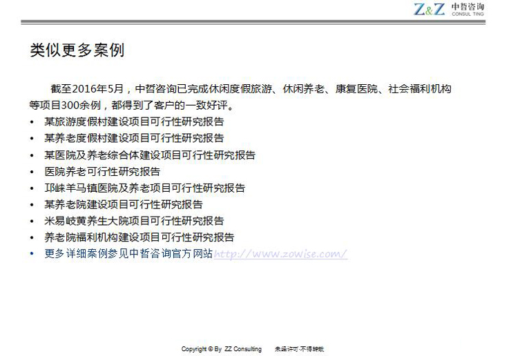 截至2016年12月,中哲咨询已完成休闲度假旅游、休闲养老、康复医院、社会福利机构等项目500余例,都得到了客户的一致好评。