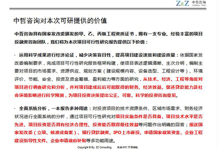中哲咨询具有国家发改委颁发的甲、乙、丙级工程资质证书,拥有一支专业、经验丰富的项目投融资咨询团队,我们将为本次项目可行性研究报告提供以下价值: