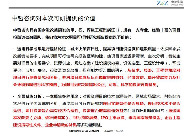 •全面系统分析,一本报告多种用途:对投资项目的技术资源条件、区域市场需求、财务经济状况进行全面系统的分析,通过项目可行性研究对项目实施条件是否具备、项目技术水平是否先进、项目投资是否具有经济合理性、投资能否取得最佳效益等问题作出明确的回答;报送国家发改委(立项、核准或备案)、银行贷款融资、IPO上市募投、申请国家政策资金、企业工程建设指导性文件、企业申请政府补贴等多功能用途。