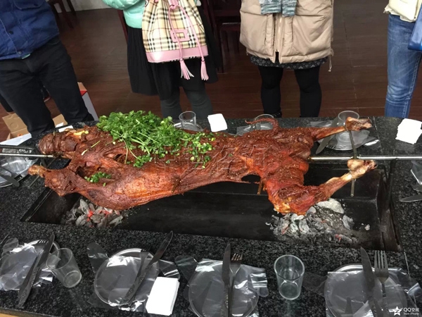 羊开烤喽!大家都围着它,等着开吃呢?有卖相,闻着香气扑鼻,就是不知道味道如何。