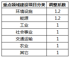 在上述基准收费标准的基础上,根据《关于深入开展终点建设项目社会稳定风险评估工作的通知》(沪发改投[2011]169号)对重点领域建设项目的划分,按照下表的具体划分标准乘以相应的调整系数,进行调整: