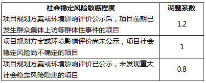 在上述收费标准的基础上,根据项目社会稳定风险评估敏感程度,按照下表的具体划分标准乘以相应的调整系数,进行调整: