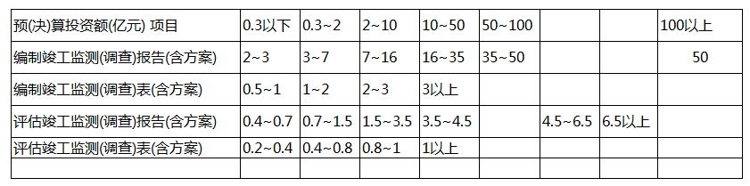 1、建设项目竣工环境影响监测评估收费标准根据预(决)投资额在对应区间内用插入法计算;